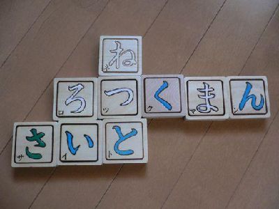 「あいうえお文字板」で、暫し童心に帰って遊ぶ親子です。